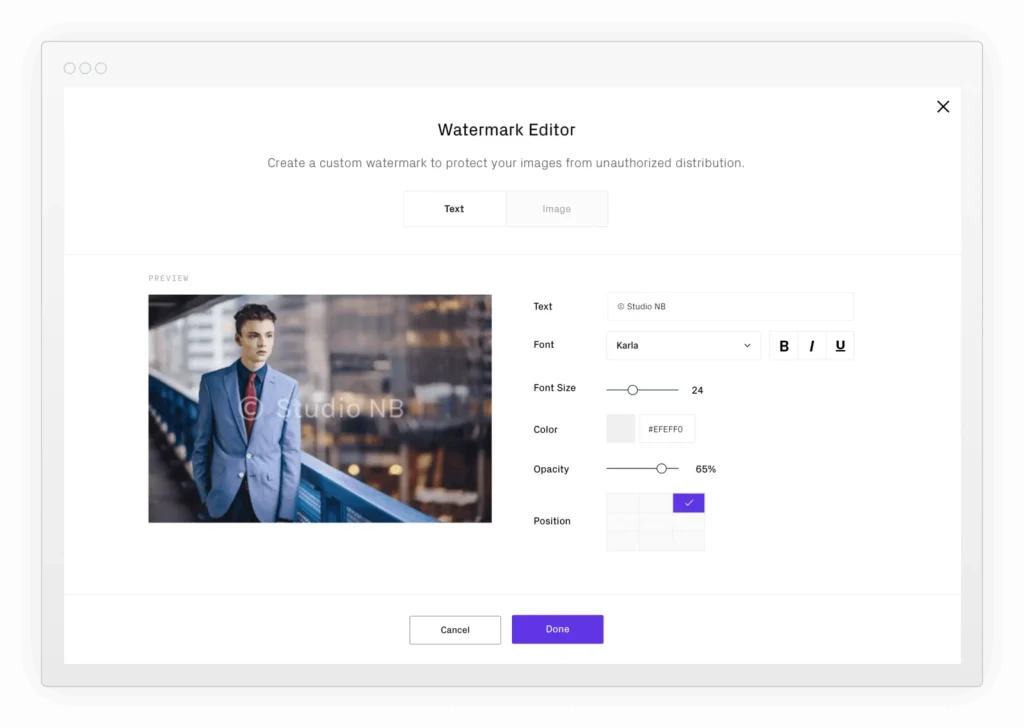 Protect your images from unauthorized distribution. Create a watermark with our built-in tool or simply upload your own.